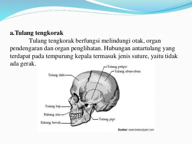 Rangka Aksial Rangka aksial merupakan tulang tulang yang berada di bagian tengah sumbu tubuh Tulang rangka aksial terdiri atas tulang kepala ruas tulang belakang tulang dada dan tulang rusuk 1 Tulang Kepala Tulang kepala terdiri atas tulang tempurung kranium dan tulang rahang Tulang kepala berfungsi sebagai pelindung otak organ